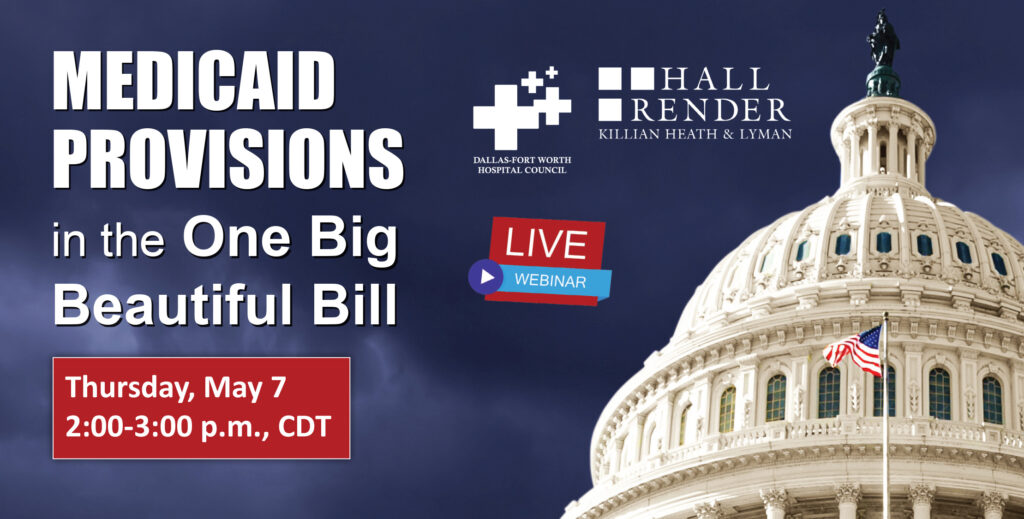 The DFW Hospital Council (DFWHC) and Hall Render will co-host the webinar “Medicaid Provisions in the One Big Beautiful Bill” on Thursday, May 7 from 2:00 p.m. – 3:00 p.m., CDT.