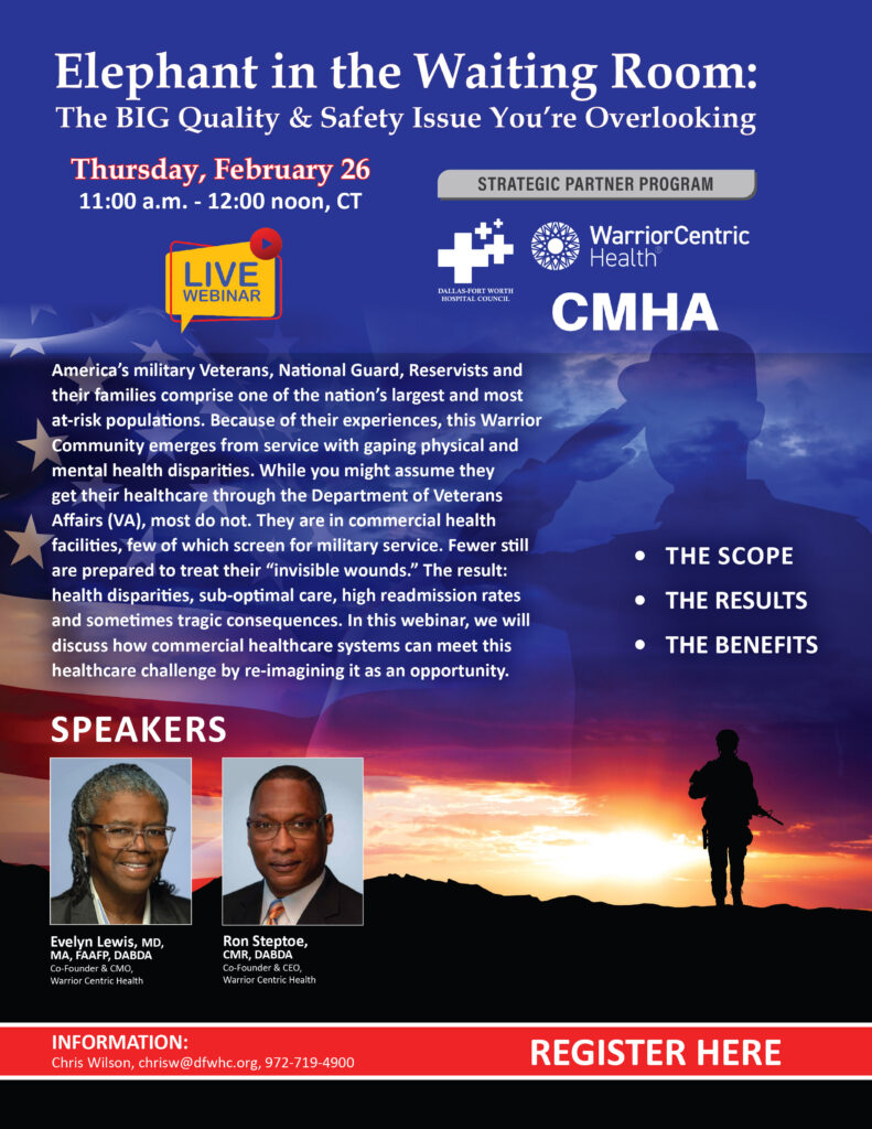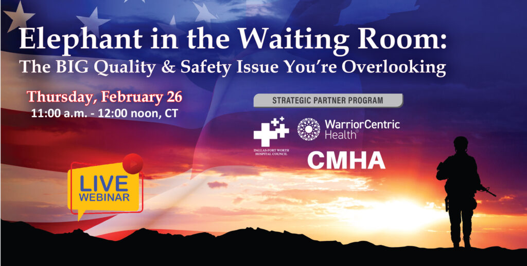 The first webinar featuring Warrior Centric Health is set for Thursday, February 26 from 11:00 a.m. to 12:00 noon. Titled “Elephant in the Waiting Room: The BIG, COSTLY Quality & Safety Issue You’re Overlooking,” the event will detail issues when treating America’s military veterans, National Guard, Reservists and their families.