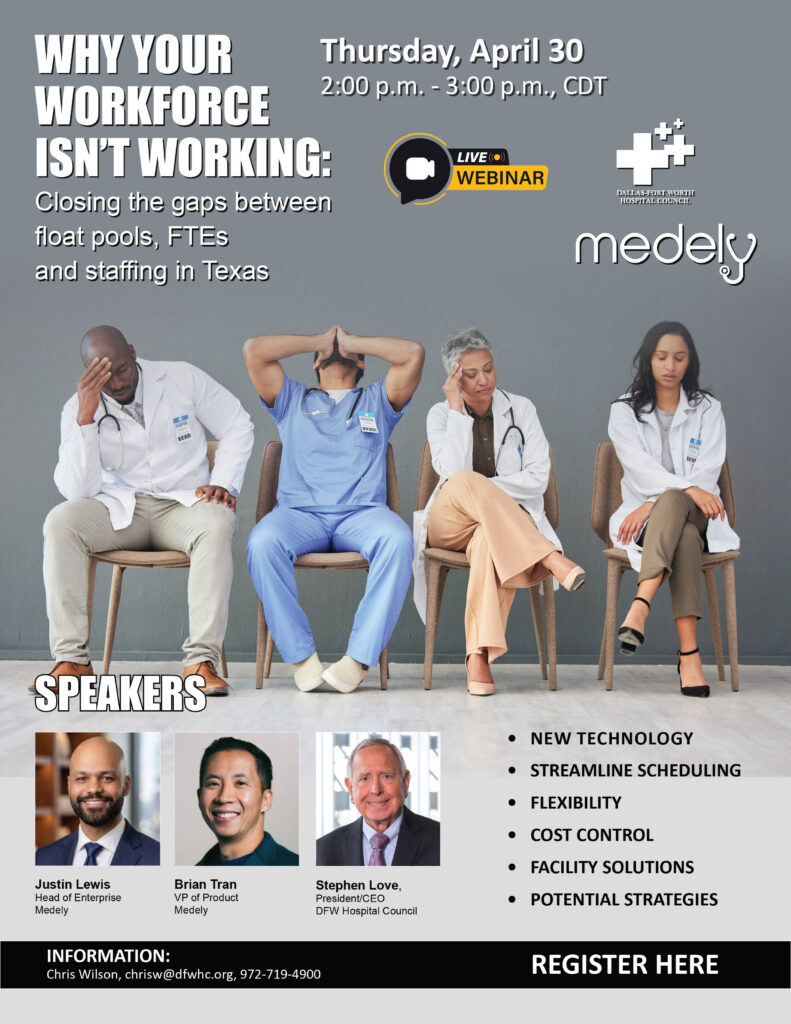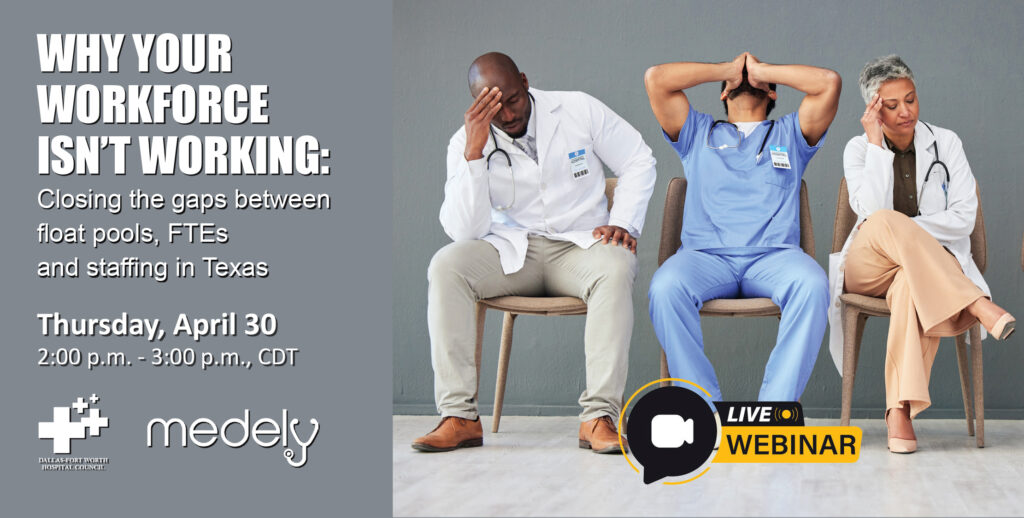The DFW Hospital Council (DFWHC) and Medley will co-host the webinar “Why Your Workforce Isn’t Working: Closing the gaps between float pools, FTEs and staffing in Texas” on Thursday, April 30 from 2:00 p.m. – 3:00 p.m., CDT.